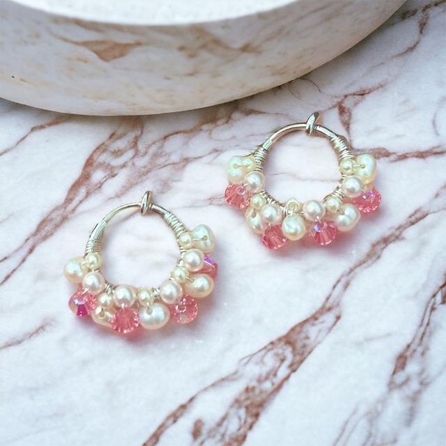 天然パールイヤリングは、スワロフスキーのピンクとホワイトの天然パールが華やかなアクセントとなっています✨ リングに巻きつけて組み合わせたデザインが、おしゃれで個性的な印象を与えます。イヤリングタイプなので、ピアスホールがない方でも気軽にお楽しみいただけます。 この天然パールイヤリングは、手作りで1つずつ丁寧に制作されています。天然パールの輝きや色合いは、自然の美しさを引き立てるようにセレクトされています。贅沢な輝きと繊細なデザインが耳元を上品に彩ります✨ 自分用はもちろん、プレゼントとしても喜ばれること間違いなしです✨ 金具:フープリング 素材:ニッケルフリー カラー:ロジウムカラー スワロフスキー:ピンク 天然パール:ホワイト サイズ:15mm ※アレルギー対応素材ですが、 全ての方にアレルギーが起こらないということでは ございませんので、アレルギー反応が出た場合ば ご使用をお控え下さい。 ※天然素材を使用しているため、サイズや形状に多少の個体差があります。取り扱いにはご注意ください。