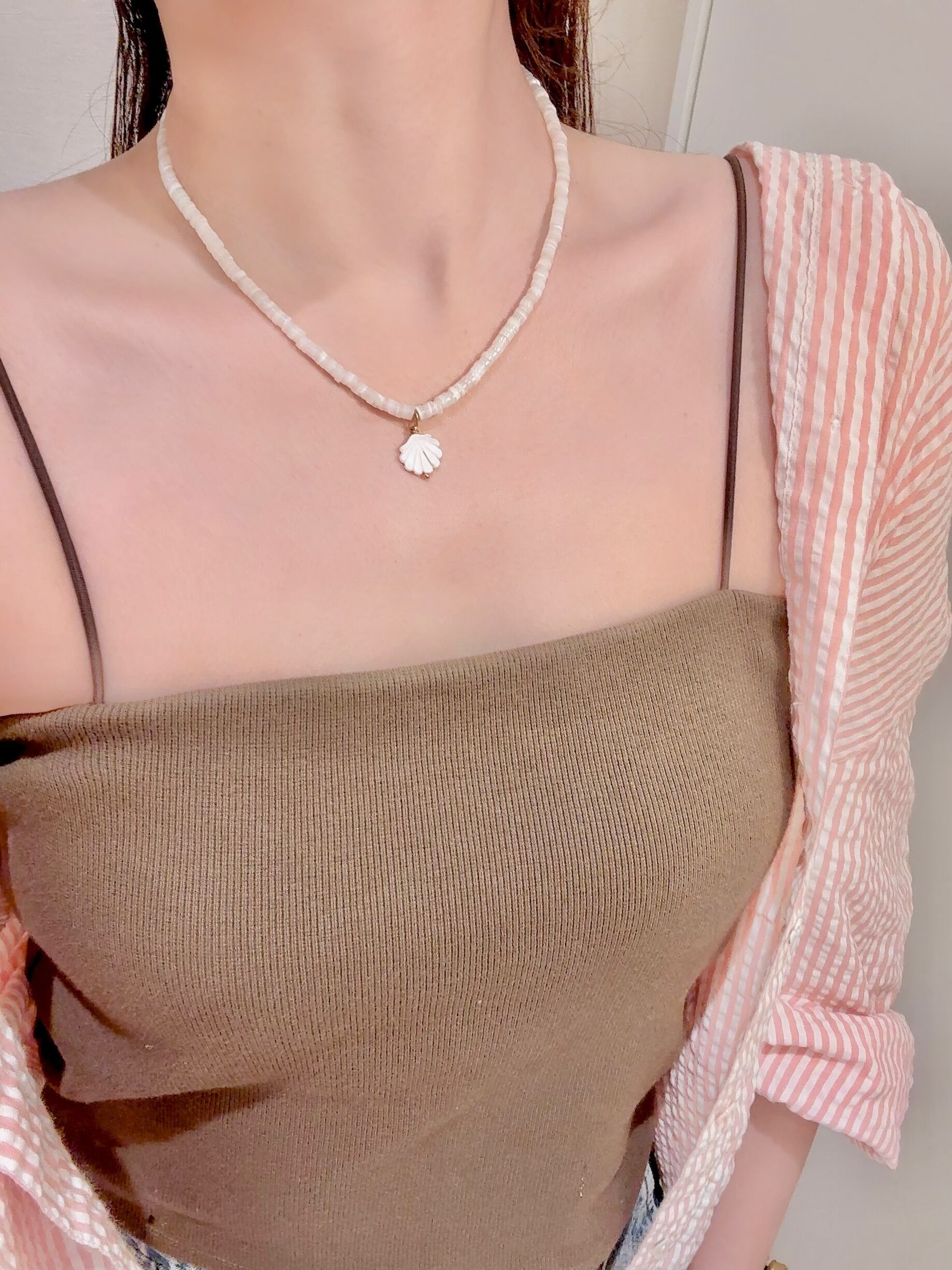ホワイトシェルネックレスで上品さをプラス! 淡水シェルを使用したこのホワイトシェルネックレスは、シンプルながらも心を打つデザインが魅力です!長さ42cmのチェーンが首元を美しく引き立て、ハート型またはシェル型の選べるモチーフです⭐️
