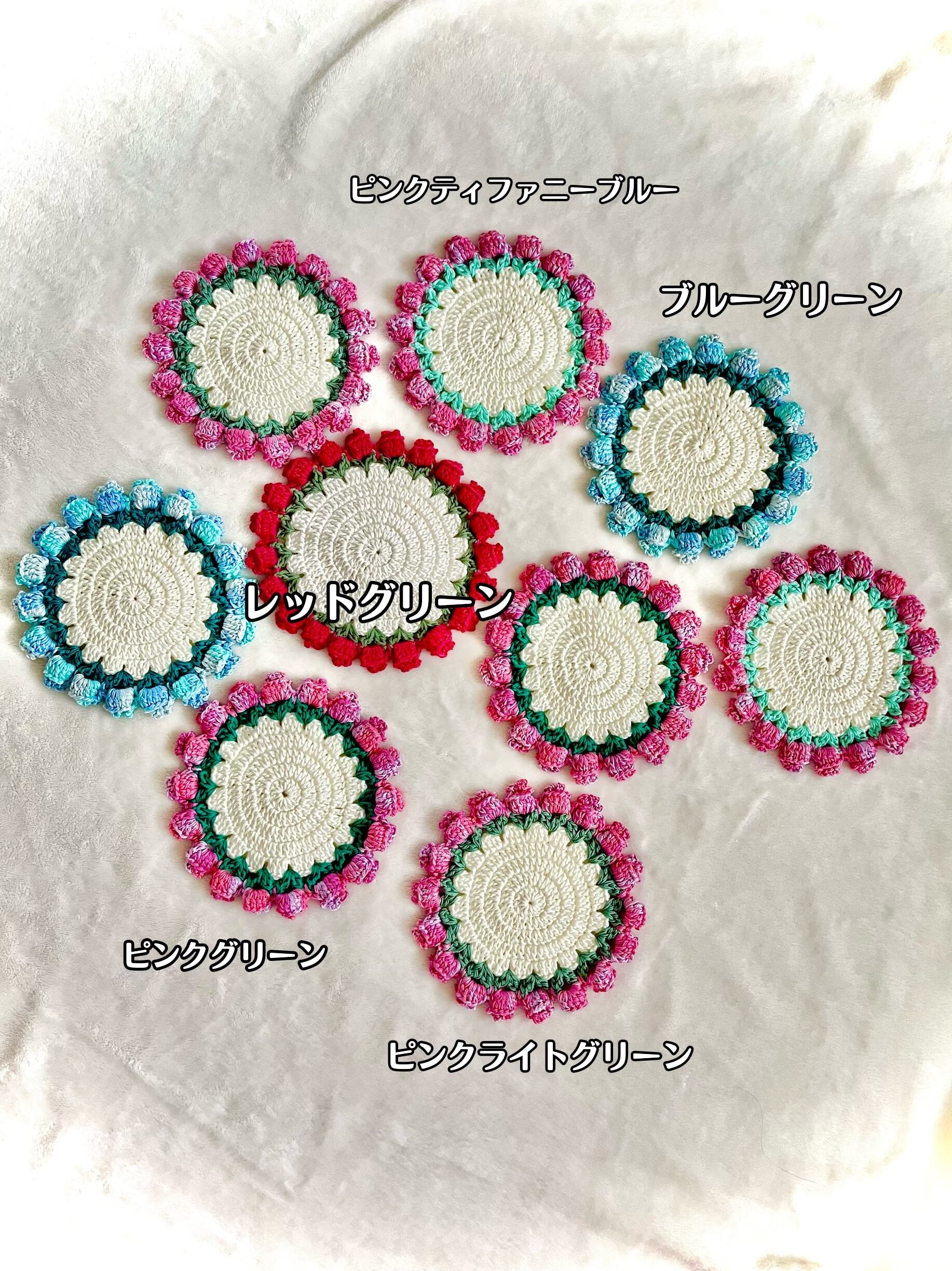 チューリップコースターは、周りにチューリップのモチーフが一つ一つついた、可愛らしいデザインのコースターです。