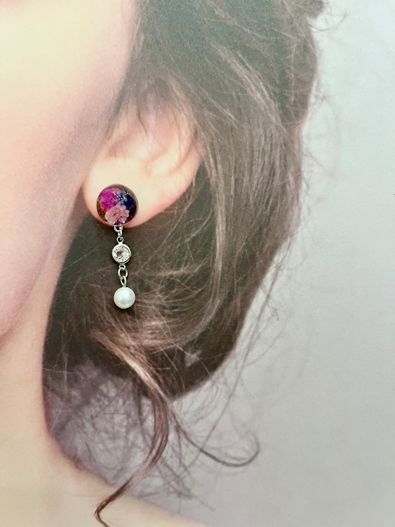華やかな色彩と独特の形状が特徴のフラワーアシンメトリーピアス。色鮮やかなお花のレジンがアクセントとなり、ブルー、パープル、イエロー、グリーンの4色展開でご用意しました。パールやストーンが煌めくデザインはまさに花のように美しいです。